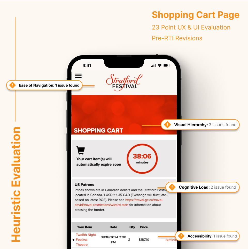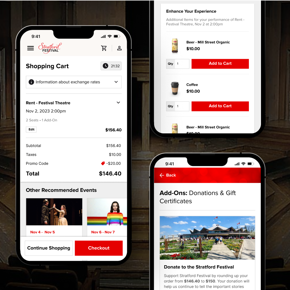 The original cart to checkout process on Stratford Festival's website was cluttered and confusing, with excessive upsells and information obscuring the path to purchase. RTI redesigned this flow by prominently displaying selected tickets and providing clear "Continue shopping" and "Checkout" buttons. Upsells were implemented seamlessly below the fold, while additional purchase options, such as donations, were moved to a separate screen within the checkout flow. This change simplified the primary purchase path, reducing distractions and making the checkout process more intuitive and efficient.