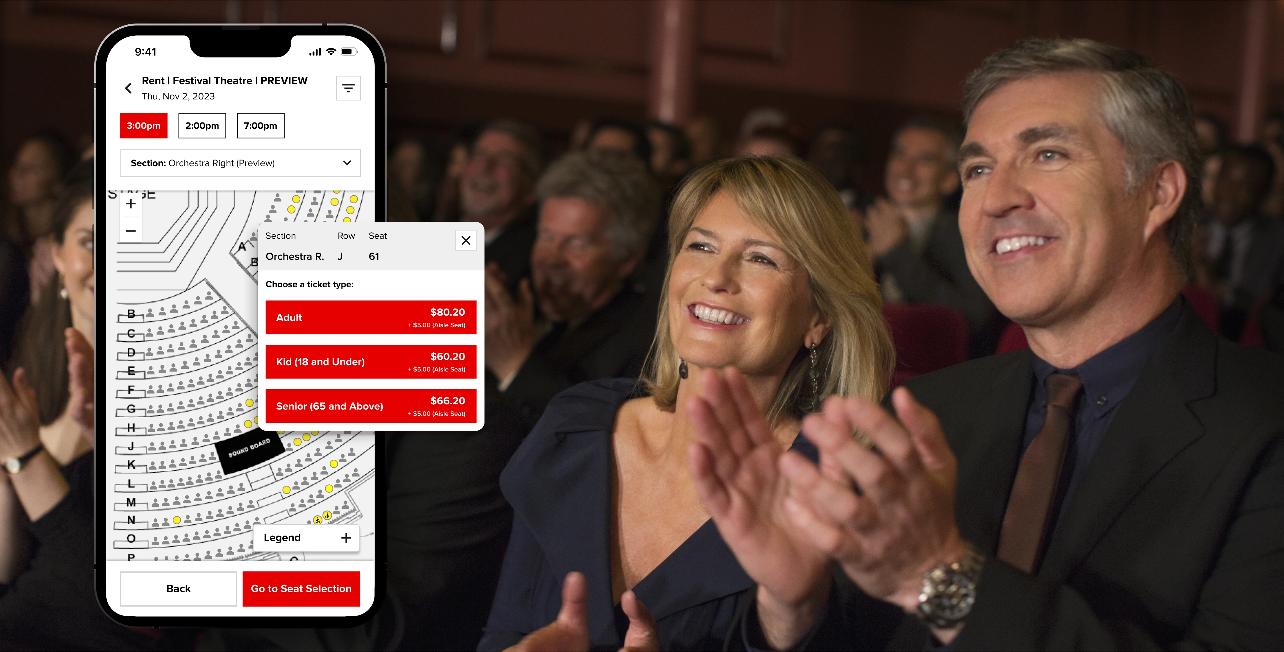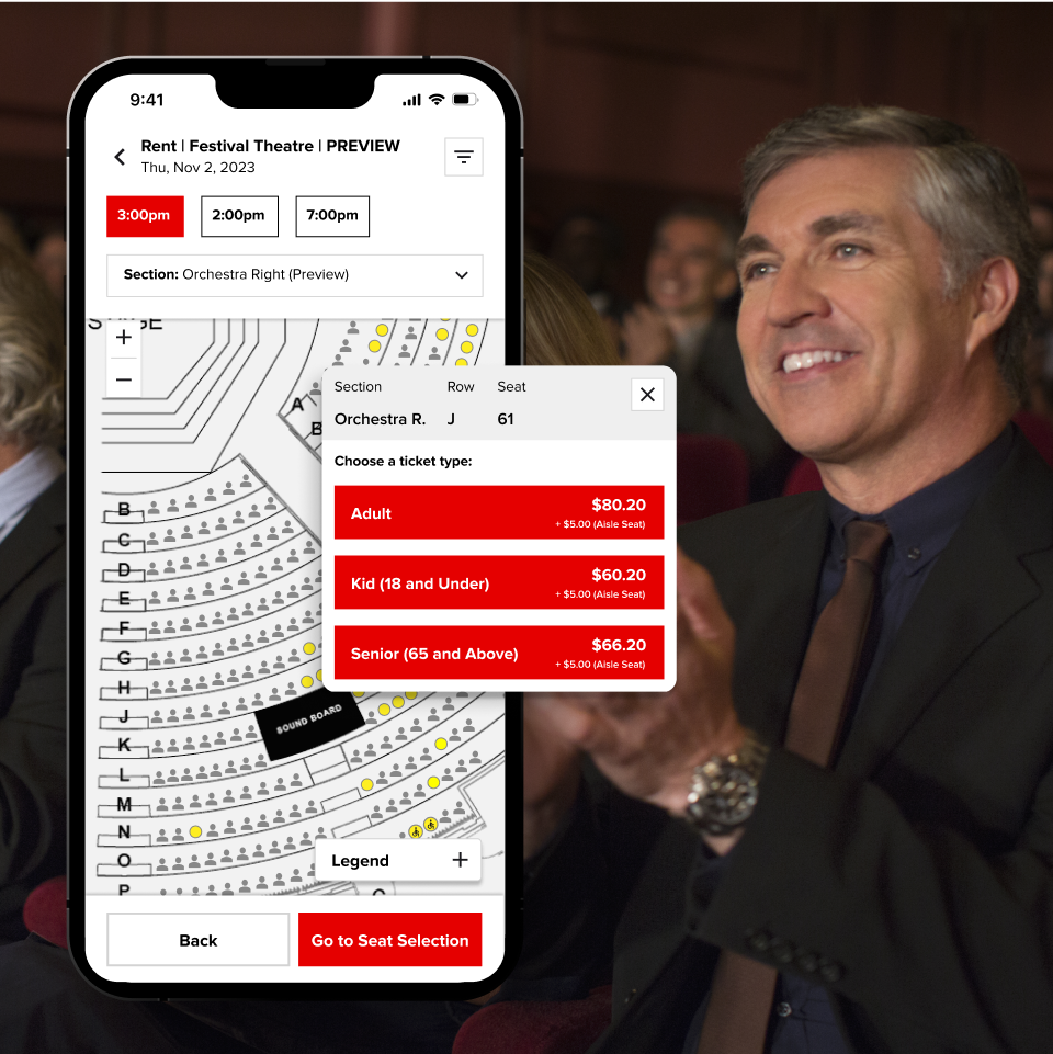 RTI streamlined the seat selection process by introducing a "preview seats" button, allowing users to view seat maps and easily toggle between different showtimes. The seat selection experience features clear stage views and section buttons with price ranges. When users select a section, they access a dedicated modal with independent controls and filters,pricing details, and a confirmation step, making it easier for users to select their desired seats.