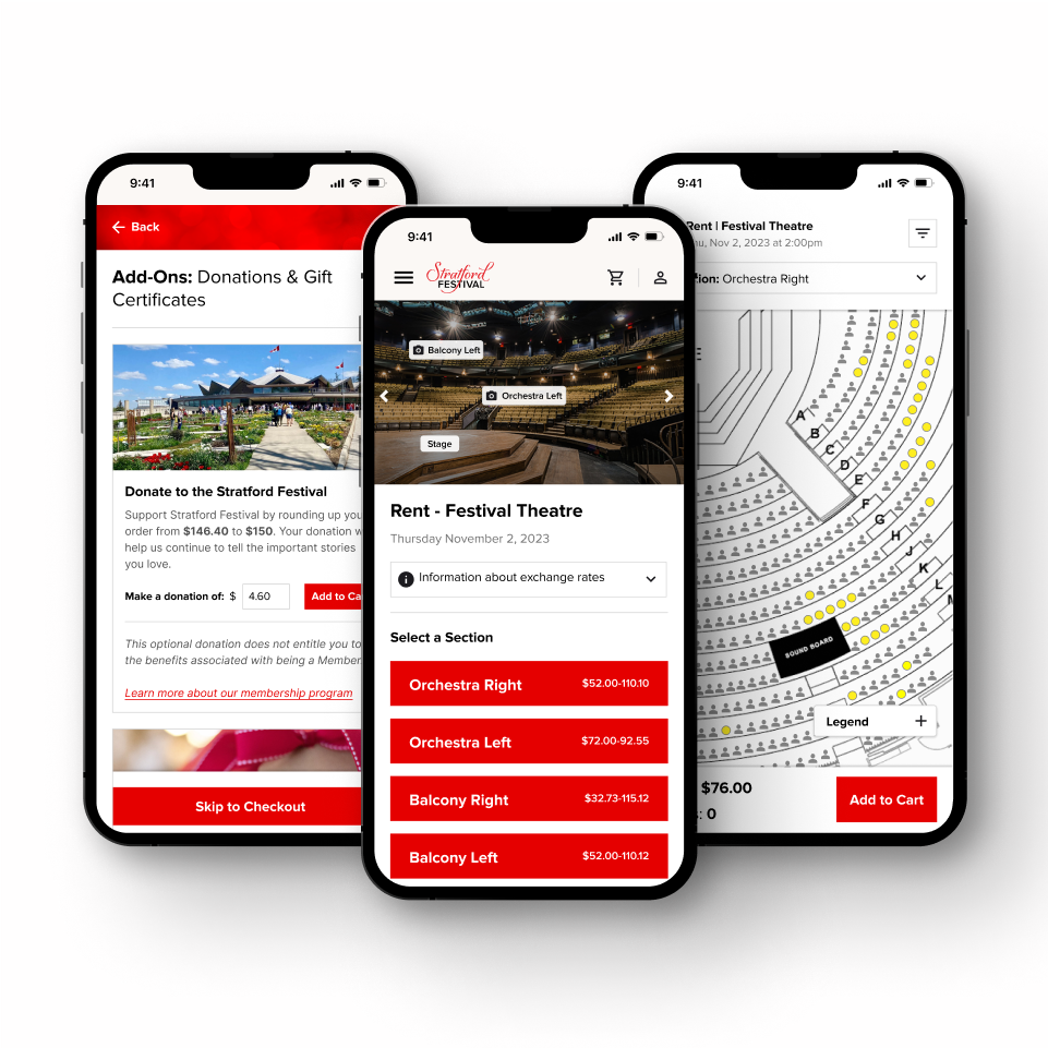 RTI conducted a comprehensive Discovery to understand Stratford Festival’s user personas, map the current experience, and complete a heuristic design audit to identify key problem areas in the user experience. We employed a mobile-first approach to redesign user flows, rectifying UX issues and streamlining navigation, seat selection, and the cart-to-checkout process. The new UX seamlessly incorporated upsells and donations, while adding a user feedback mechanism post-checkout.
